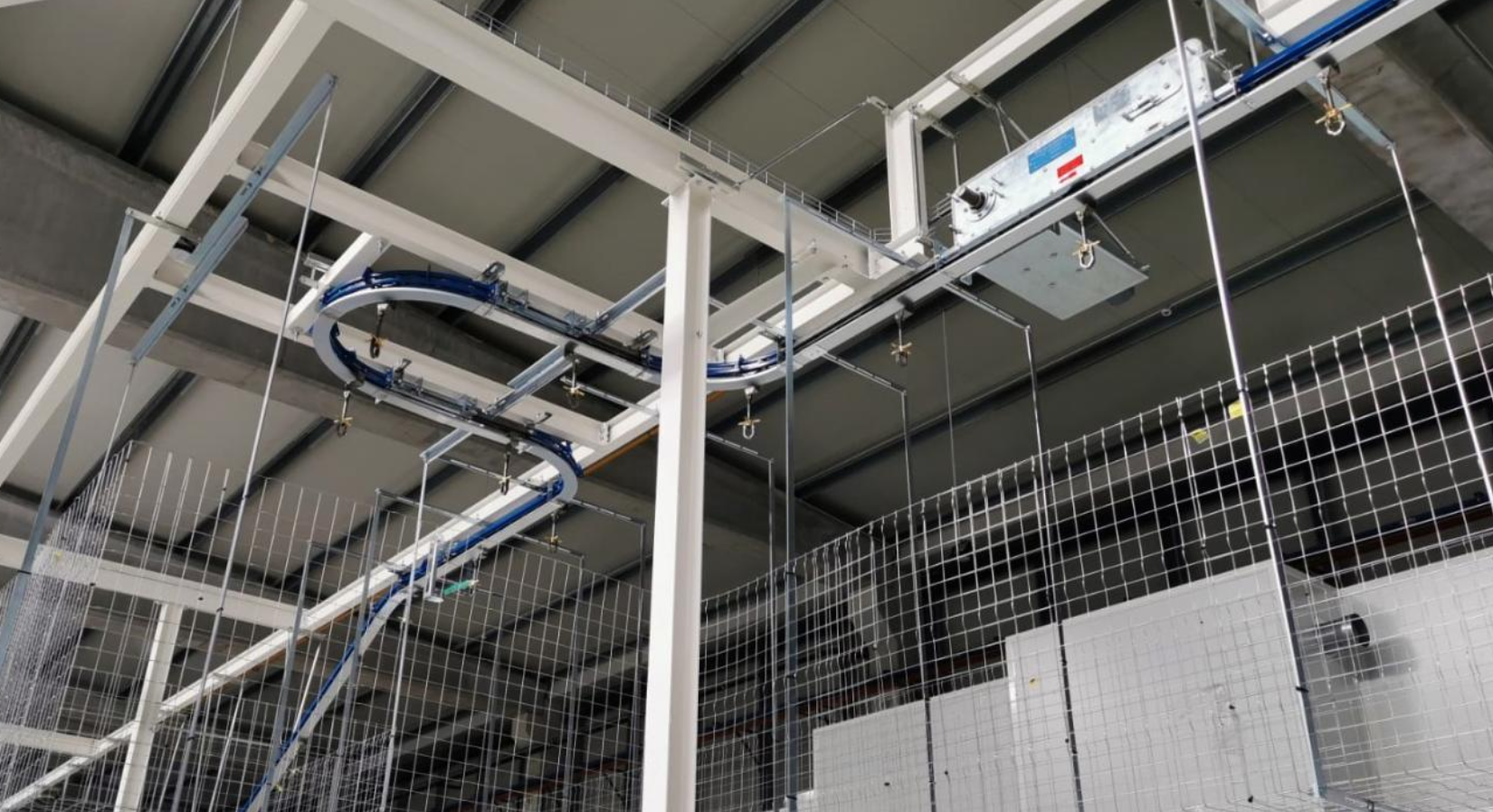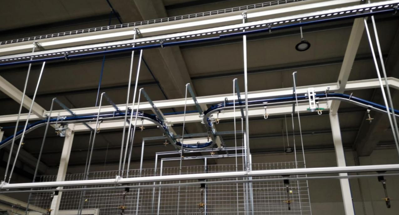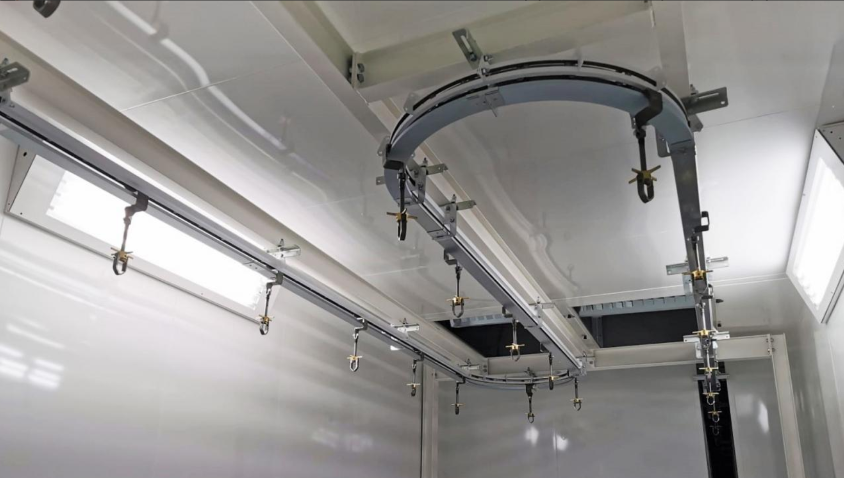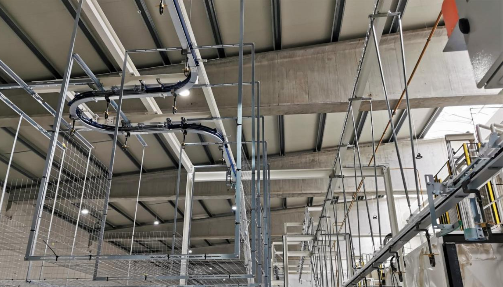 - Open I-beam rail in 3″, 4″, or 6″ sizes with powered chain on trolleys.